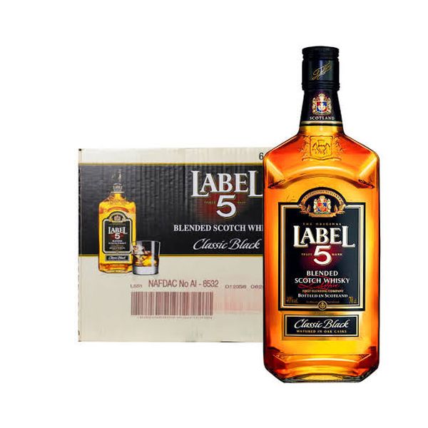 Label 5 Classic Black Blended Scotch Whisky is a refined and balanced spirit with a smooth, smoky character, presented in a sleek black bottle.